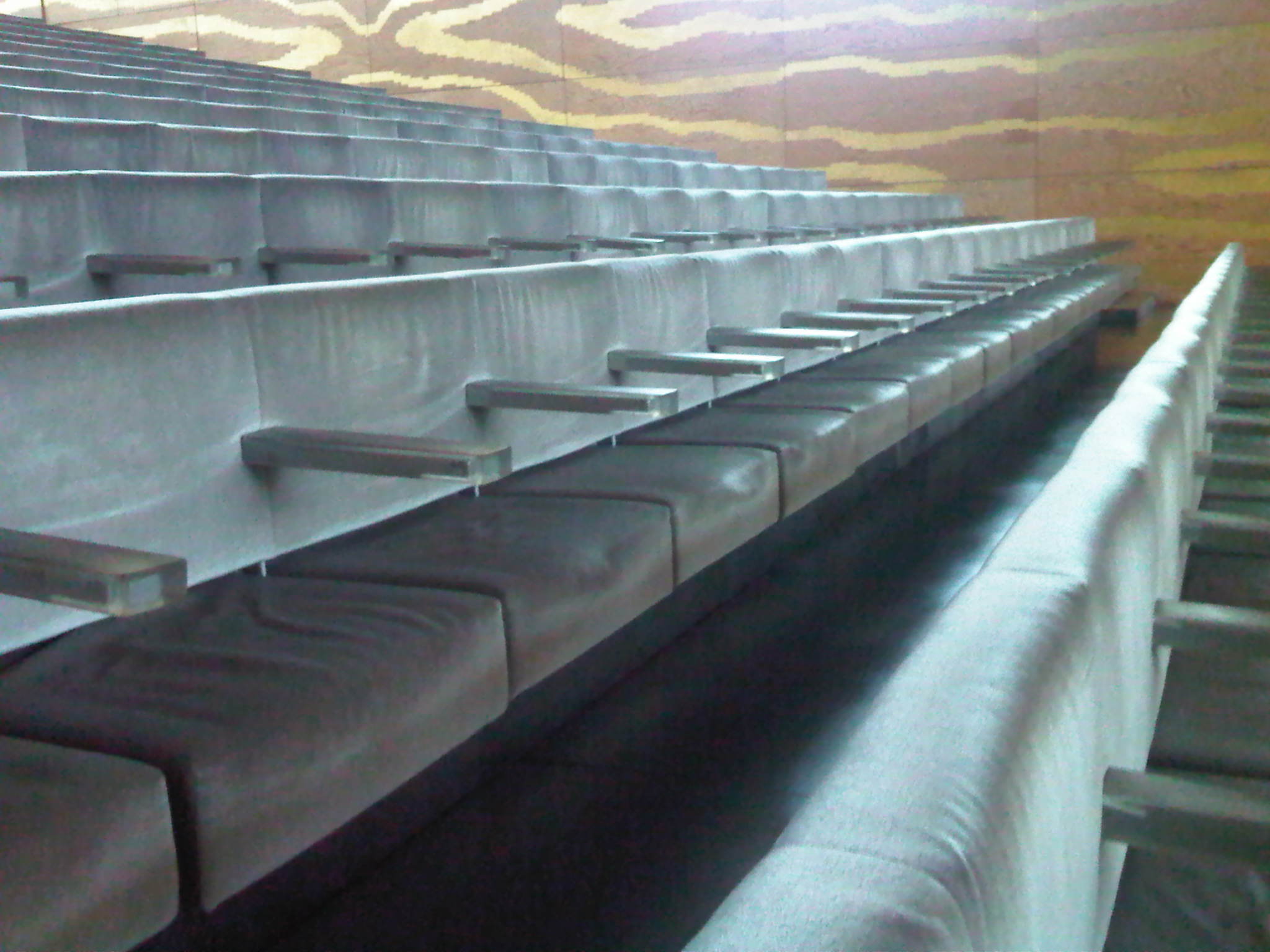 Het licht reflecteert bovendien in de zogeheten ‘taglie dorade’, patronen aangebracht in goudverf. Er is in totaal zeven kilogram goud verwerkt in de muren van deze zaal. Dit brengt een geweldige schittering teweeg, die zelfs op de donkere dag van mijn bezoek indrukwekkend was, en een warmte en sfeer die niet onderdoen voor de retro inrichting van de oude Vredenburgzaal.