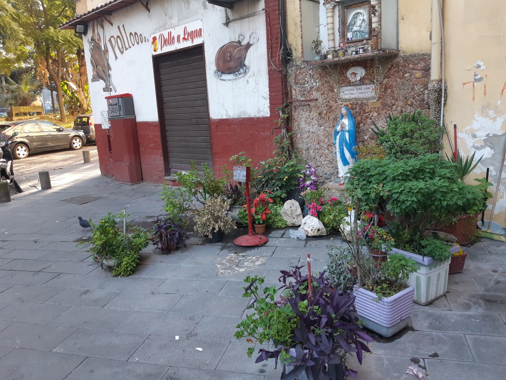 Bij ons om de hoek hangen slingers met lichtgevende letters boven de straat. Ze vormen songteksten van de populaire zanger Pino Daniele. ‘Napule è ‘na carta sporca’ staat er, oftewel: ‘Napels is een vies stuk papier’, maar ook: ‘Napule è mille culure, Napule è mille paure’. Napels is duizend kleuren en duizend angsten. Het lied vat het karakter van de stad mooi samen.