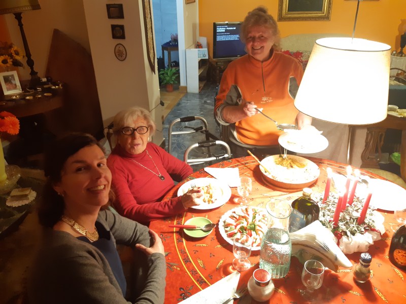 Maar de laatste studente was net vertrokken, en Ernesta zou met kerstmis alleen zijn; haar drie zoons en kleinkinderen, die verspreid over het land wonen, hadden andere plannen. “Wil jij niet langskomen”, vroeg ze, “dan kunnen we samen Tortellini al brodo eten.” Ik vond het een goed plan. En zo geschiedde, op eerste kerstdag maakten we samen met haar Oekraïense verzorgster Gina een viergangenmenu met als toetje Torta al Caprese.