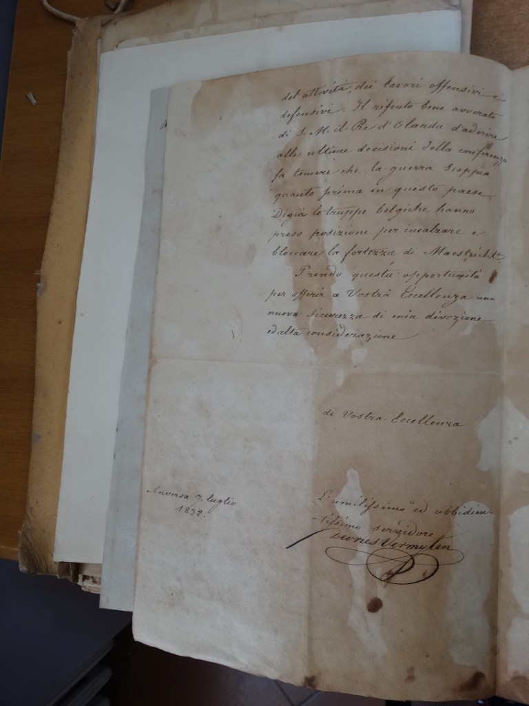 Het viel mij tijdens het fotograferen op hoe vlot leesbaar de prachtig gekrulde letters in de brieven nog zijn; het verschilt bijna niet van het hedendaagse Italiaans. Het taalgebruik is uiteraard wel zeer formeel – elke brief begint met ‘Eccellenza’, en eindigt met ‘l’ubbidientissimo servidore (uw zeer gehoorzame dienaar) De Vries Vermylen’.